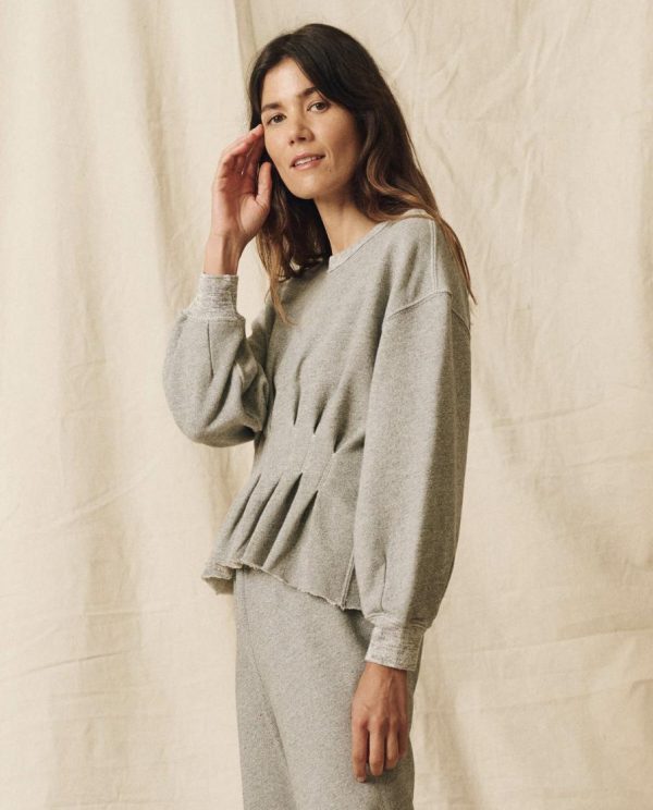 The Corset Sweatshirt. is our newest twist on a classic crewneck sweatshirt. Inspired by vintage pieces with Victorian corset details, its box pleats gently cinch in at the waist to create a subtle high-low hem. Finishing touches include a ribbed cuff with darts that create the perfect blouson sleeve, a raw hem, and slightly oversized dropped shoulders that add an ironic feel.