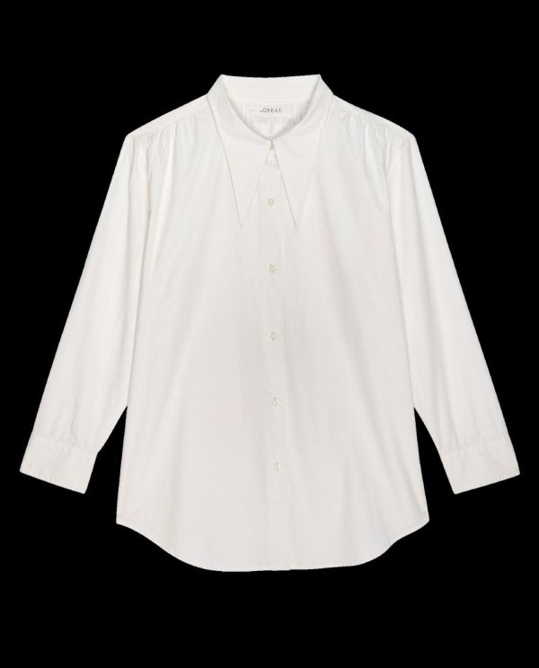 This classic white button up shirt has a relaxed menswear inspired fit with an oversized pointed collar referencing favorites from the 1970s. Wear alone or under a crewneck sweater or The College Sweatshirt.