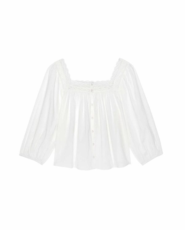 The Eyelet Button Sleep Top. is a romantic addition to your sleepwear collection. Crafted from supersoft and lightweight cotton voile fabric, the top is adorned with a Victorian-inspired eyelet lace trim and finished with a delicate scalloped edge. This top was designed to fit easy through the body for added comfort and features elasticated sleeve openings with delicate volume and dainty buttons up the front. Pair it back to the matching The Eyelet Easy Sleep Pant. or vintage denim for a casual daytime look.