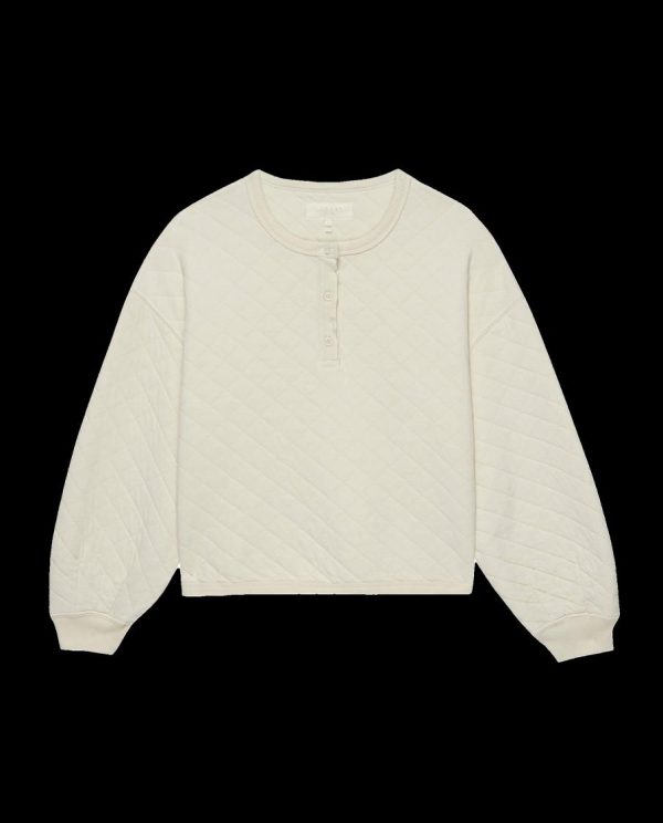 Lovingly made locally in Los Angeles, The Quilted Henley Sleep Sweatshirt. is crafted from lightly padded and ultra-soft quilted cotton. This silhouette has a relaxed and boxy fit, with a slightly cropped length, billowy sleeves, a henley placket, and rib at the hemline and cuffs.